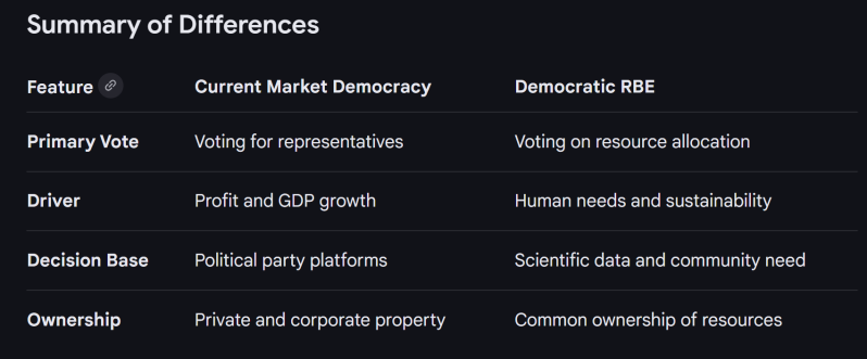 A democratic, vote-based Resource-Based Economy (RBE) would shift decision-making from market-driven competition to collective management of planetary resources. In this model, instead of voting for politicians to manage a monetary budget, citizens vote directly on the allocation, conservation, and technological application of shared resources to meet human needs.